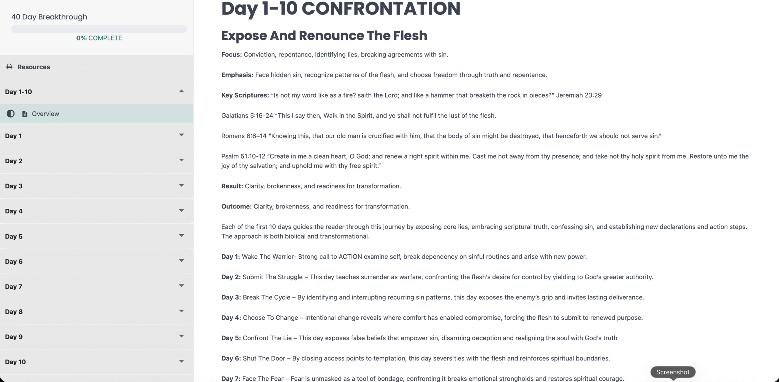 Includes the 10-day section’s focus, emphasis, key scriptures, result, outcome, as well as the daily breakdowns and action steps.